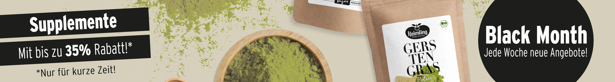 In der dritten Woche unseres Black Month erwarten Dich Top-Supplemente mit bis zu 35 % Rabatt – plus der Tribest Personal Blender passend dazu bis zu 25 % reduziert. Jetzt ausgewählte Nahrungsergänzungsmittel, Proteinpulver und Superfoods günstiger sichern: hochwertig, bio und ideal für Deinen täglichen Nährstoff-Boost.