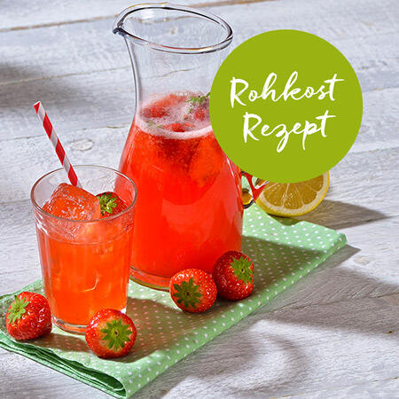 Für die Erdbeersoße alle Erdbeeren mit dem Zitronensaft, den Datteln und dem Süßungsmittel im Hochleistungsmixer zu einer glatten Soße verarbeiten.